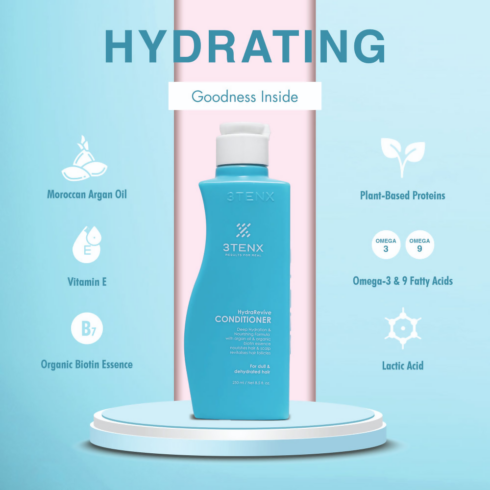 - Discover unmatched hydration and intensive nourishment with 3TENX HydraRevive Conditioner. Our unique formulation, infused with Moroccan Argan Oil, Vitamin E, Omega-3 & 9 Fatty Acids, and Organic Biotin Essence, protects, moisturizes, and improves manageability, leaving hair lustrous, shiny, and flawlessly smooth.
