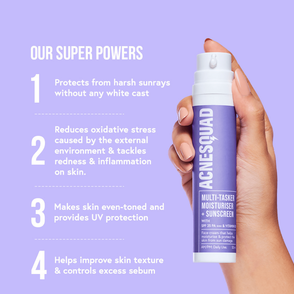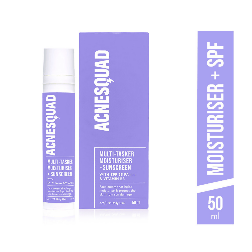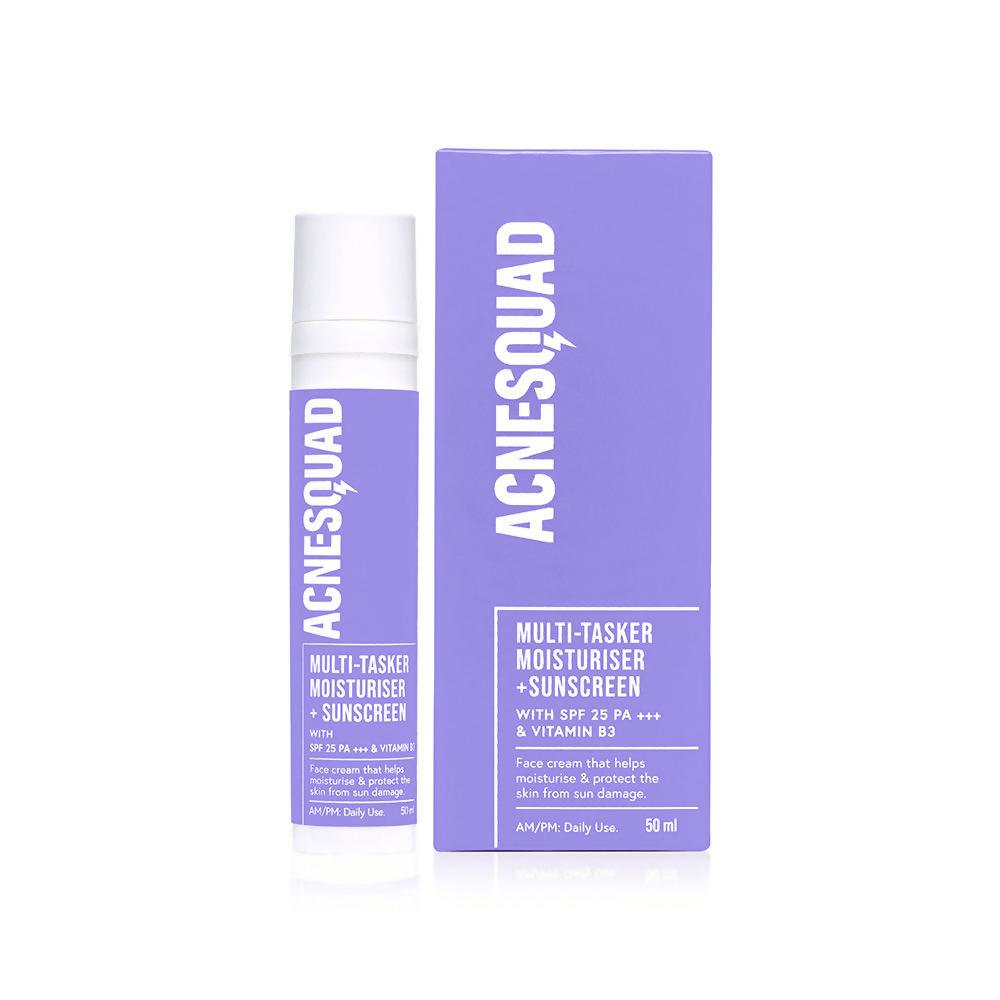 - Crafted with a robust blend of components such as Vitamin B3 and Vitamin E, this Multi-Tasker Moisturiser + Sunscreen shields your skin from harmful UV rays and external elements that trigger acne and inflammation.