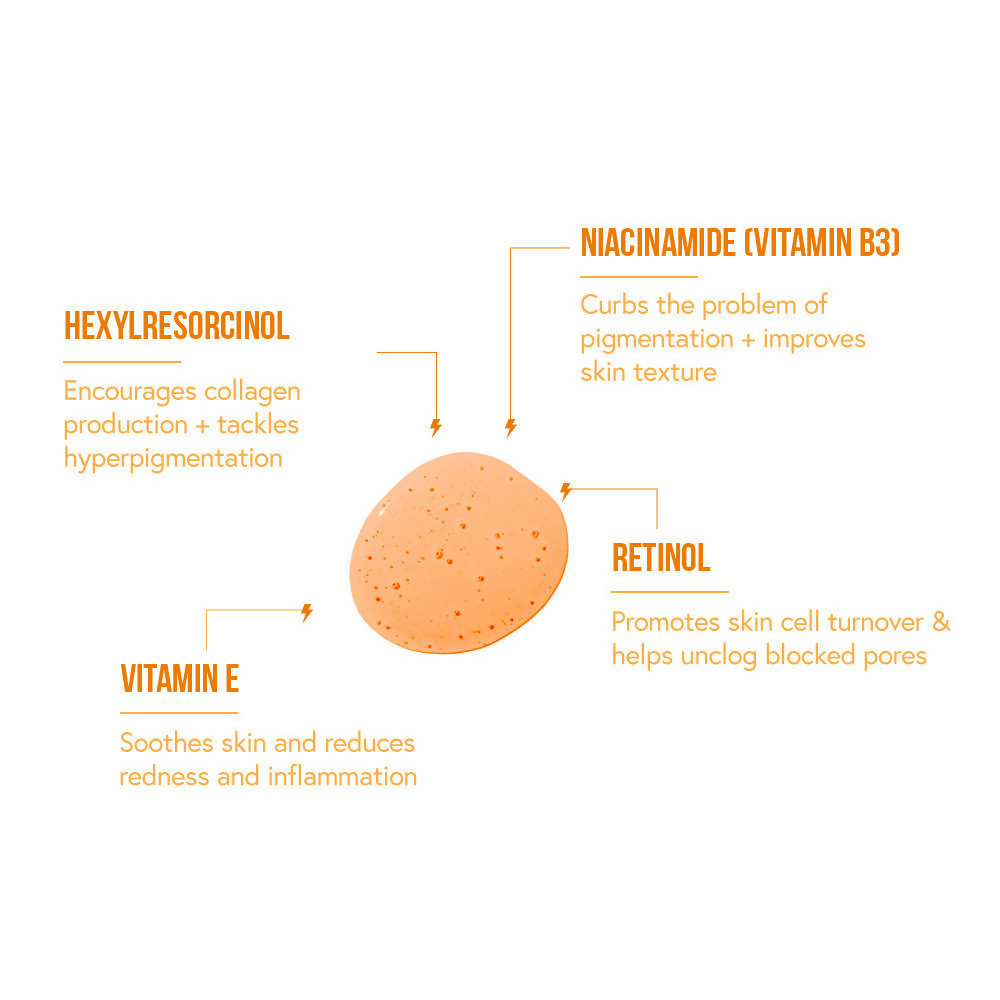 - This swiftly absorbing serum minimizes pigmentation in just 4 weeks, reinstates your skin’s natural radiance, and promotes collagen synthesis through a distinctive blend of Vitamin B3, Vitamin E, Hexylresorcinol, and Retinol.