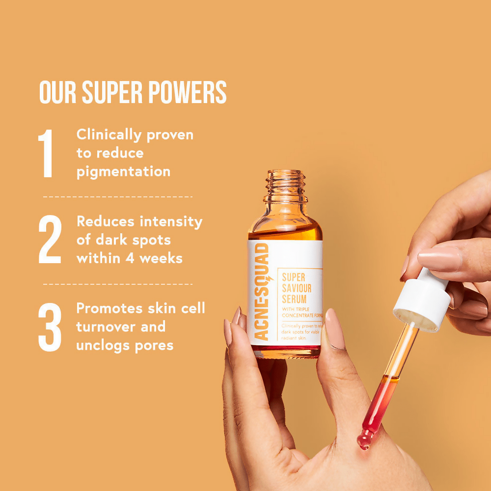 - Featuring our exclusive Triple Concentrate Formula, composed of Niacinamide, Hexylresorcinol, and Retinol, the Super Saviour Serum is precisely what your skin craves when you’ve reached Stage 4: Post-Breakout. At this stage, dark spots and scars become your latest adversaries—it's the moment to rescue, reset, and rejuvenate your skin.