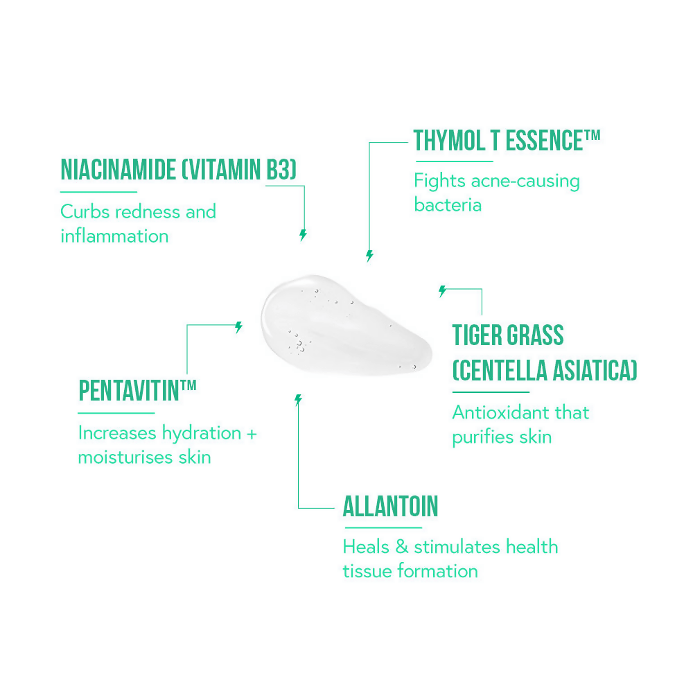- The Acne Squad Breakout Terminator Serum is crafted with our exclusive blend of Thymol T Essence, Pentavitin, Niacinamide, Allantoin, and Tiger Grass.