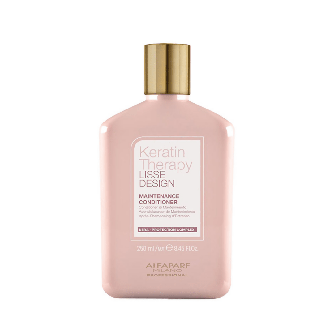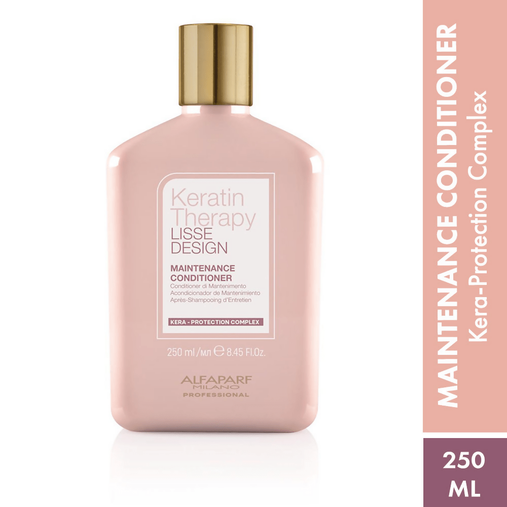 Alfaparf Milano Lisse Design Keratin Therapy Maintenance Conditioner: This conditioning cream nourishes the hair and helps maintain the hair's cosmetic quality achieved with the salon treatment. Infused with keratin and babassu oil. Free from sulfates.