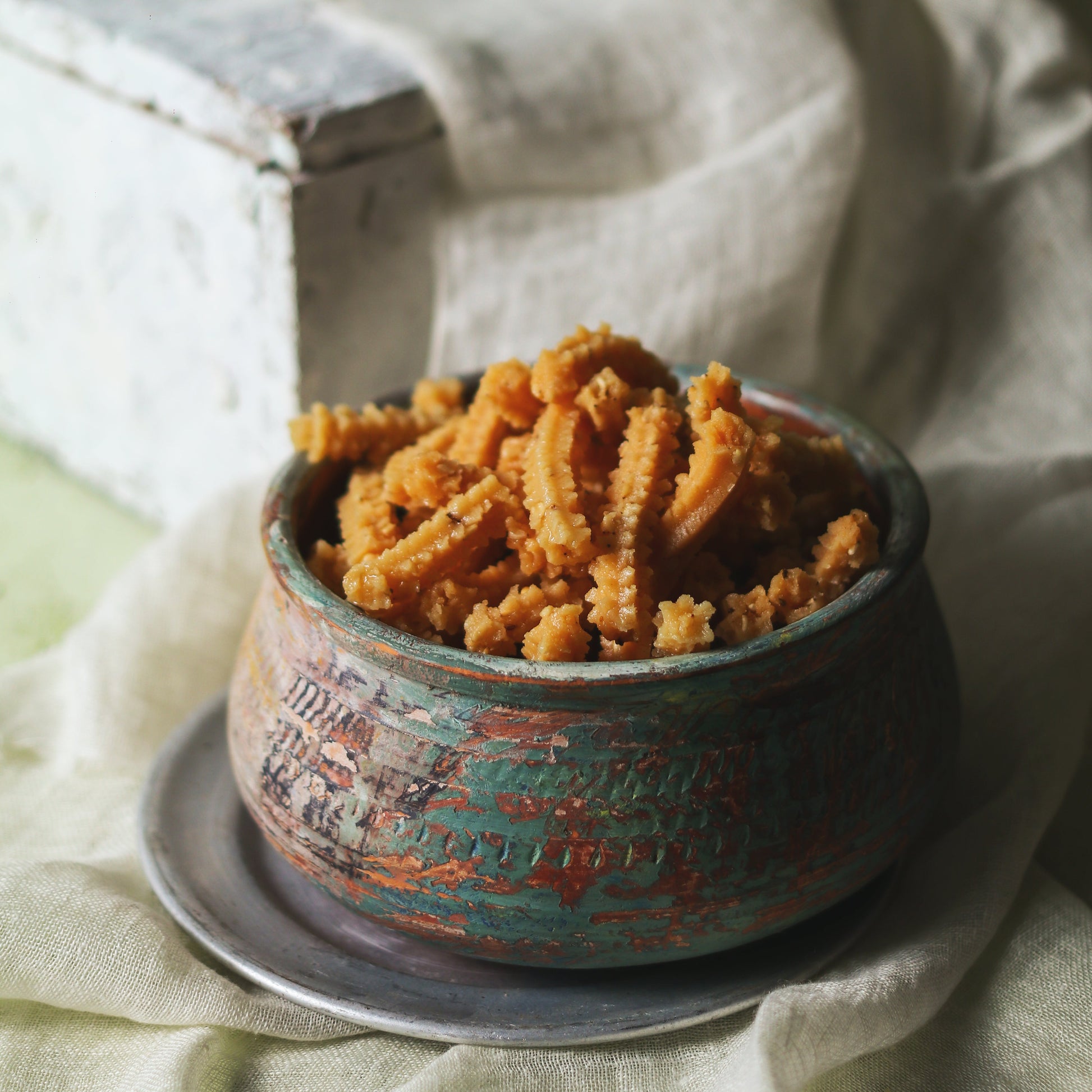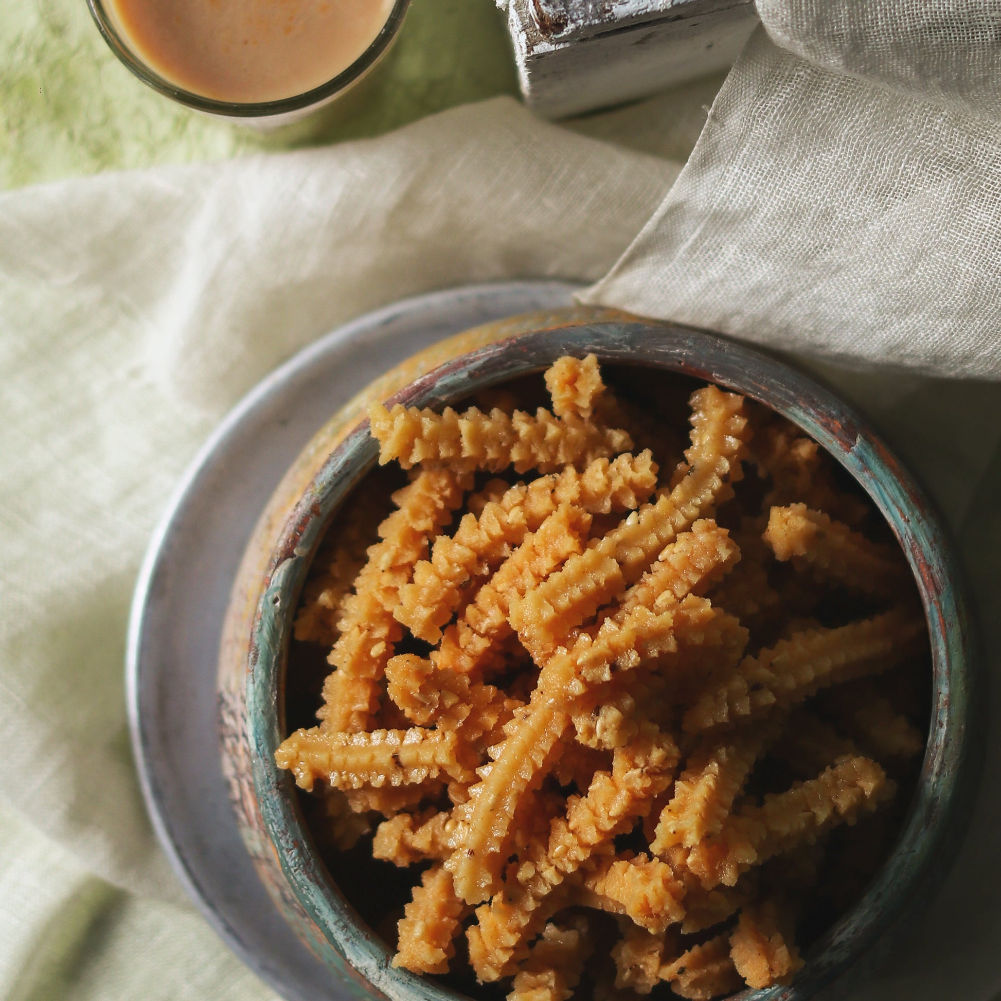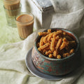 Relish the crunch of Murukulu, a beloved snack from South India, crafted from rice flour and infused with the Flavor of sesame and cumin seeds, perfect for those who appreciate a crispy treat.