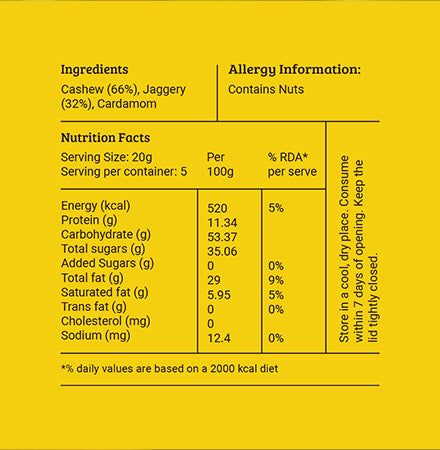 Meticulously selected Cashew Nuts, expertly oven-roasted and enveloped in generous layers of Jaggery, creating a crispy and delightful indulgence.