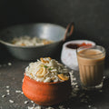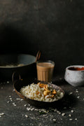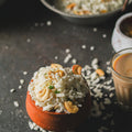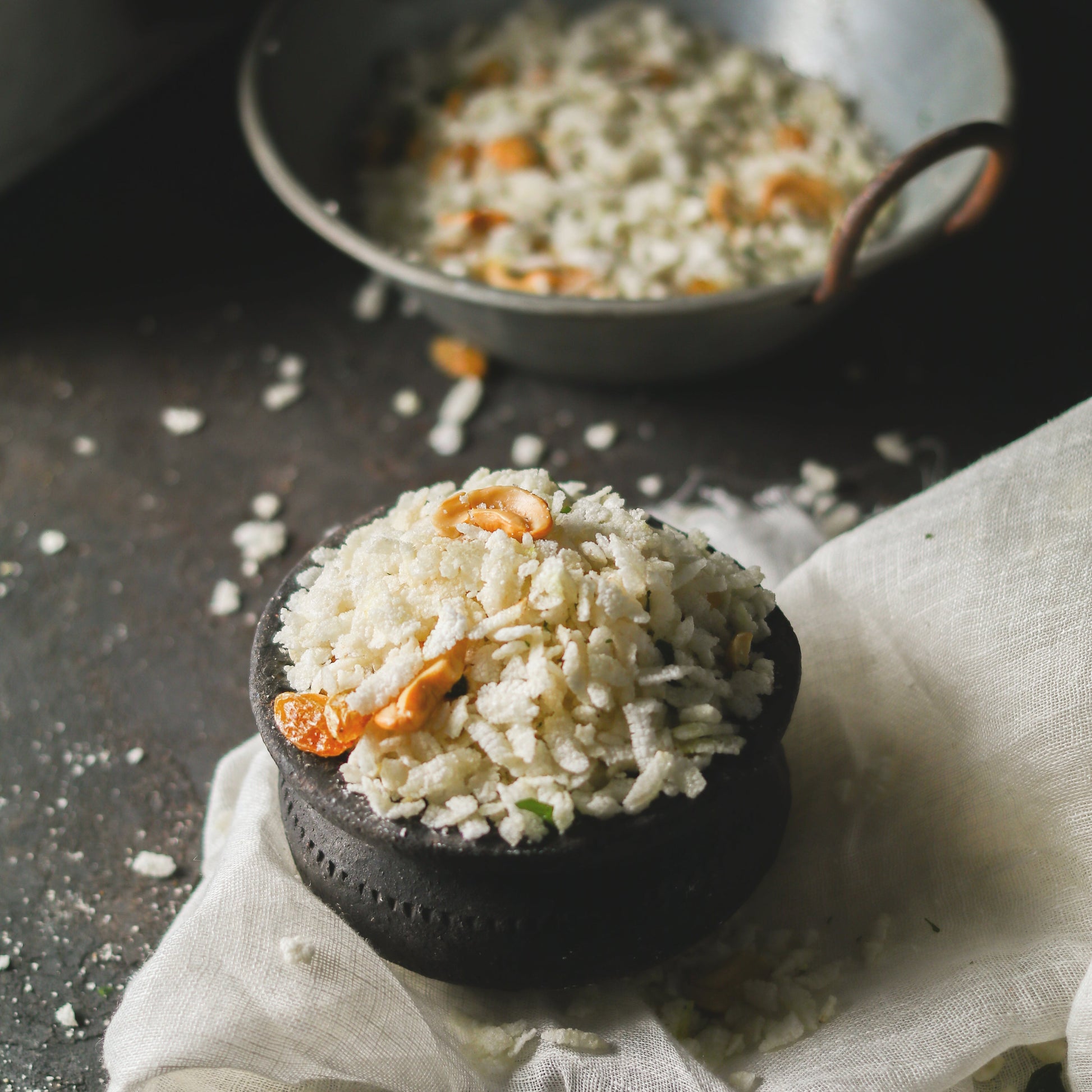 Pressed rice enlivened with cashews, raisins, curry leaves, and a touch of sugar.