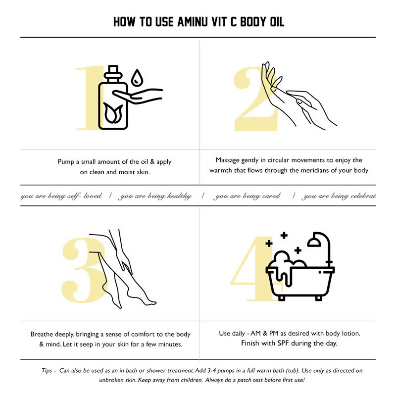 Aminu’s Vit C Body Oil is crafted from a blend of 9 deeply enriching oils, including cold-pressed coconut oil, grapeseed oil, Moroccan argan oil, and more! This Vitamin C body oil is the ideal alternative to your regular body lotion, designed to firm, rejuvenate, soften, and enhance the tone of your skin in just a few weeks! A fantastic source of skin nourishment, Vit C body oil will invigorate your senses and harmonize your mind and spirit. If the fragrance doesn’t captivate you, the luminous glow it bestows upon your skin certainly will!Features: