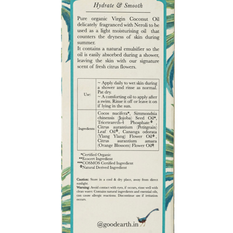 - This lightweight summer moisturizer features pure organic virgin coconut oil enhanced with the delicate fragrance of neroli. It includes a natural emulsifier, allowing the oil to be effortlessly absorbed during a shower, leaving your skin enveloped in our signature scent of fresh citrus blossoms. Free from parabens, it ensures a nourishing feel for your skin.