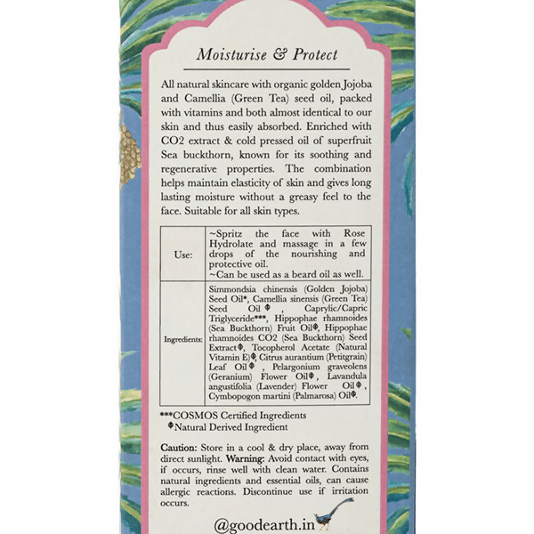 - This facial oil is formulated with organic golden jojoba and camellia (green tea) seed oil, supplemented by cold-pressed sea buckthorn oil, celebrated for its calming and rejuvenating qualities. This blend supports skin elasticity and provides enduring hydration without imparting a greasy sensation to the face. It is suitable for all skin types and is free from parabens.