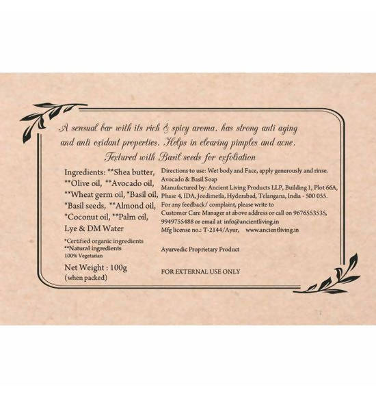 Ancient Living Avocado & Basil Luxury Handmade Soap Enriched With Wheat Germ Oil, Shea Butter: 100 gm