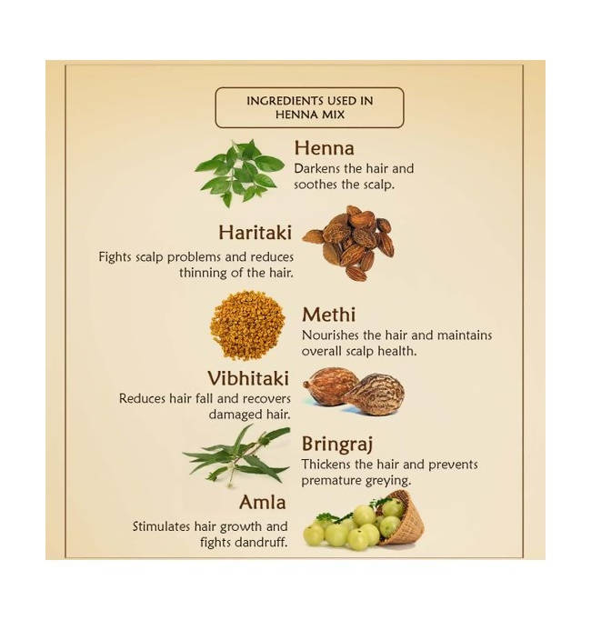 Henna and Neeli are two traditional, effective hair dyes cherished through generations. Bhringraj aids in enhancing the darkness of hair and is a key herb in hair care. This blend is enriched with Triphala, comprising Amalaki, Bibhitaki, and Haritaki. It is revered as a tridoshic rasayan, offering a balancing and rejuvenating influence on the three fundamental elements that sustain human life.