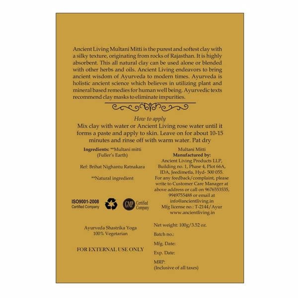 Ancient Living Multani Mitti Natural Skin Toner - Potent Moisturizer, Banishes Blackheads, Refines & Enhances Complexion: 100 gm