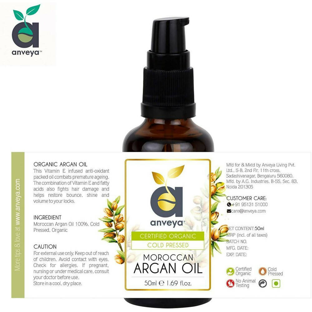 - This antioxidant-rich oil, abundant in Vitamin E, helps counteract early signs of aging. The blend of Vitamin E and essential fatty acids addresses hair damage, contributing to the rejuvenation of bounce, shine, and volume in your tresses. Anveya's Moroccan Argan Oil is 100% Organic Cold-Pressed from raw Argan nuts, sourced directly from Morocco - the natural habitat of the Argan tree. This smooth and silky oil is readily absorbed by the skin and possesses a nutty fragrance.