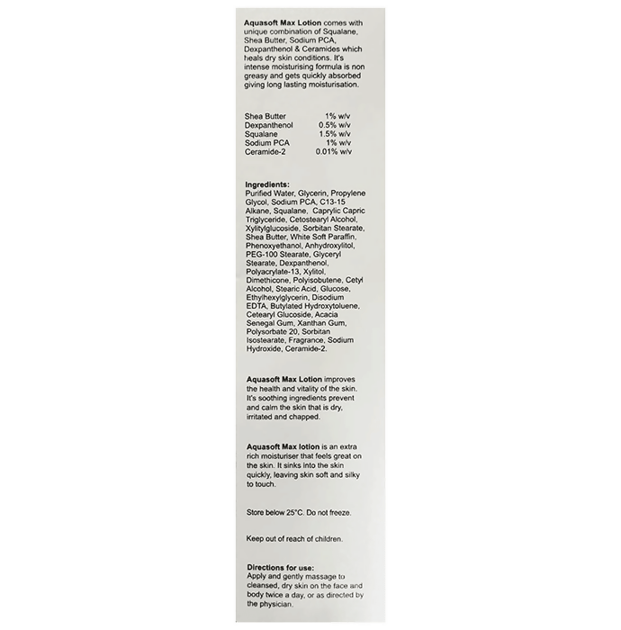 - Aquasoft Max Intense Moisturising Lotion is a hydrating cream with ceramide designed to deliver profound moisture and nourishment to your skin. This lotion is crafted to make your skin feel smoother, boost its vitality, and enhance its overall health. Aquasoft Max Intense Moisturising Lotion is tailored to counteract dryness and alleviate conditions of dry skin.