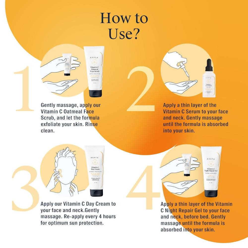 After cleansing your face, apply the Vitamin C Oatmeal Face Scrub on damp skin. Massage gently, scrub, and rinse thoroughly.