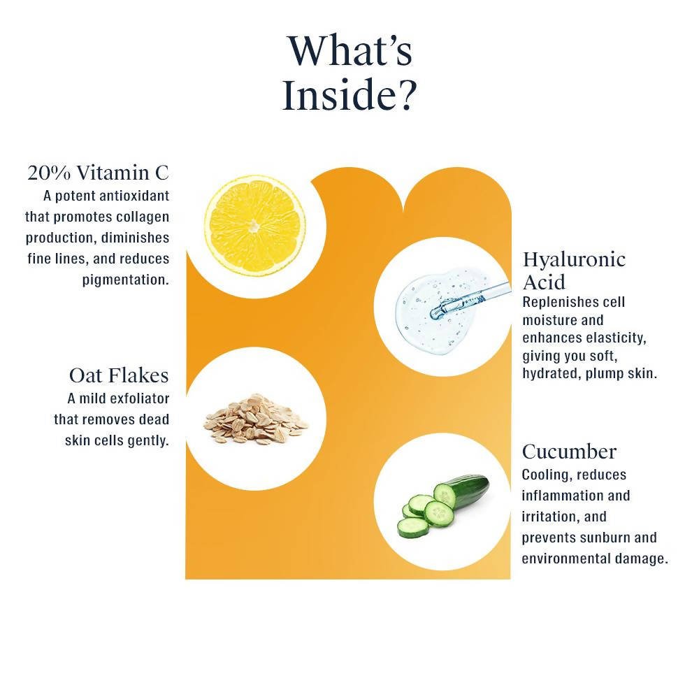 Our Vitamin C Overnight Face Regimen is a potent combination featuring all our premium Vitamin C formulations. It includes an Oatmeal Face Scrub, a nourishing exfoliant that effectively eliminates dead skin cells while preserving your skin’s protective layer. The Vitamin C Face Serum is crafted with potent antioxidants to enhance collagen synthesis, diminish pigmentation, and provide intense hydration. Also part of the set is our Vitamin C Day Cream with SPF 15+, a lightweight moisturizing formula that safeguards against sun damage and optimizes UV protection, complemented by the Vitamin C Night Repair Gel that supports your skin's natural repair processes, accelerates cell renewal, and fortifies your skin barrier.