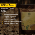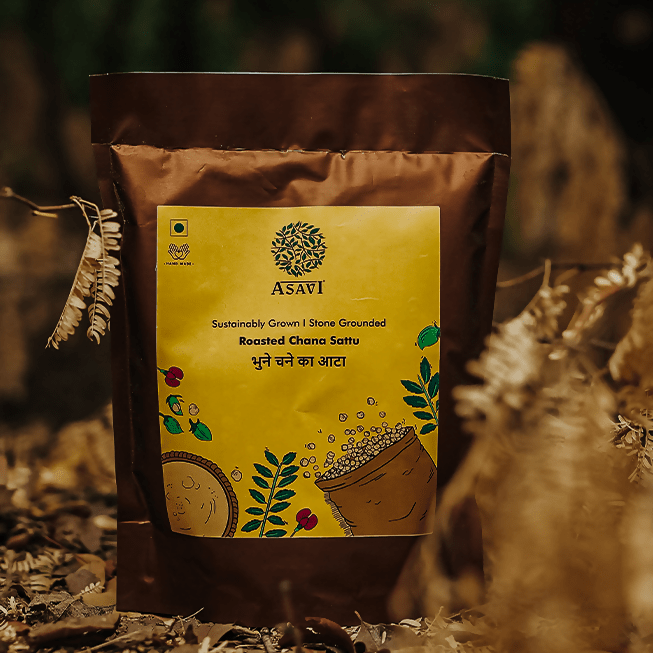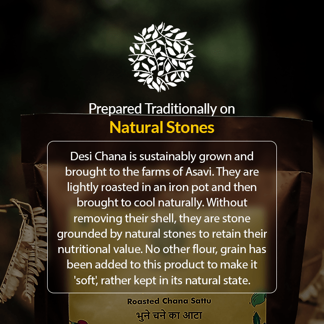 About The Product: Desi Chana is cultivated with sustainability in mind and delivered directly to Asavi's farms. They undergo a gentle roasting process in an iron pot and are then allowed to cool naturally. Retaining their protective shell, they are ground using traditional stones to preserve their nutritional essence. This product remains unaltered by any other flour or grain, maintaining its authentic form.