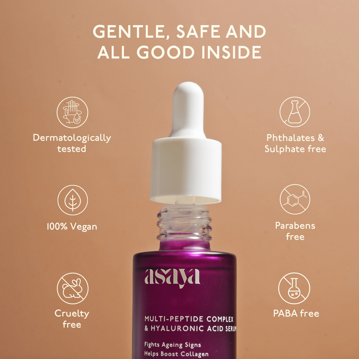 - INTENSE HYDRATION & BARRIER SUPPORT: Asaya 5% multi peptide serum also harnesses the moisturizing capabilities of Hyaluronic Acid, which aids in strengthening the skin’s lipid barrier, ensuring prolonged moisture retention and enhanced elasticity.