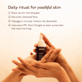 - Apply a few drops of serum to your cleansed face, then gently massage into the skin with a circular motion until fully absorbed.