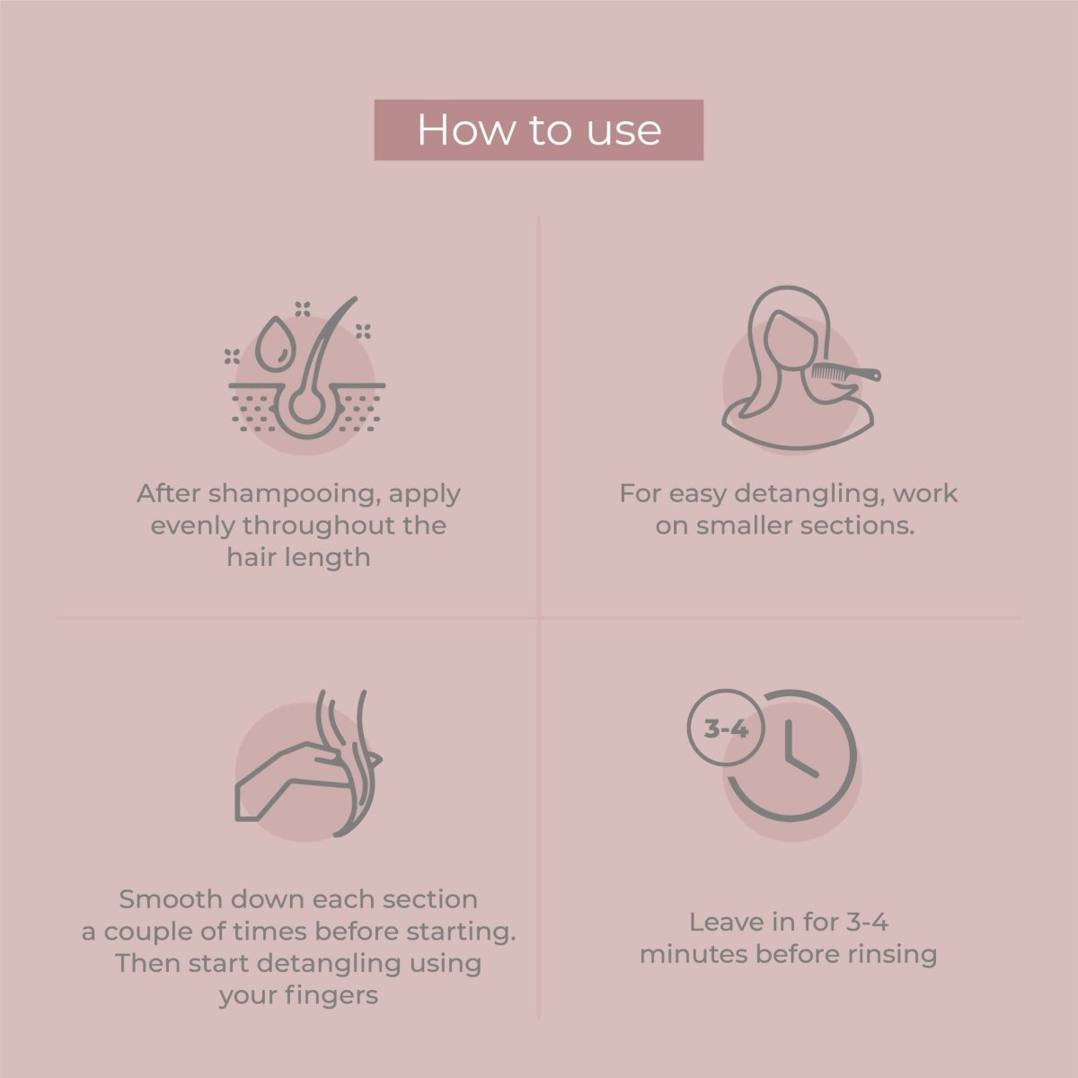 - Begin detangling using your fingers from the tips upward. Allow it to sit for 3-4 minutes before rinsing thoroughly.