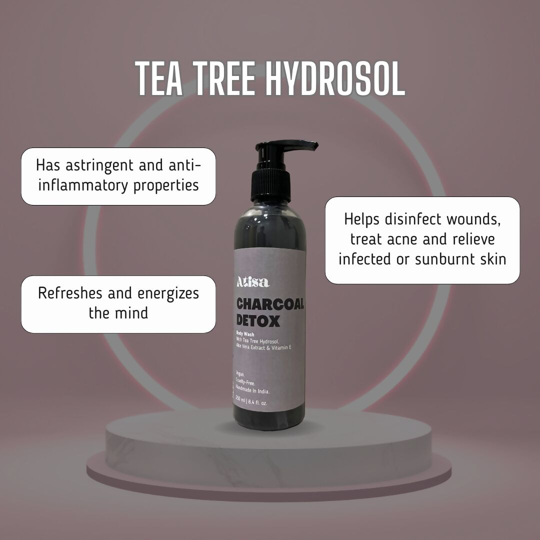 Revitalize your skin with a burst of freshness and moisture through Atisa's range of body washes, offering a distinctive and unforgettable fragrance journey! Infused with natural hydrosols, which are milder than essential oils yet retain all their beneficial properties, these hydrosols penetrate the skin effortlessly, enriching it from the inside out. The Charcoal Detox variant is infused with Tea Tree Hydrosol, known for its astringent and anti-inflammatory qualities, aiding in the care of acne-prone, irritated, or sun-damaged skin, while invigorating and uplifting the spirit. Enhanced by the nourishment of Vitamin E, Aloe Vera Extract, and Glycerine, it ensures optimal skin care.