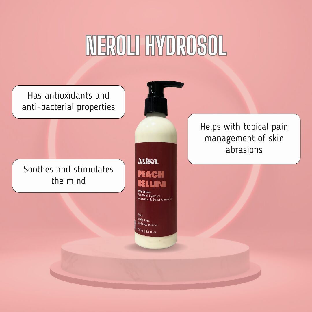 Indulge in the sensation of deeply hydrated skin without the oily residue with Atisa's exclusive range of body lotions, offering a distinct and unforgettable aromatic journey! Composed with natural hydrosols, these are a milder form of essential oils yet retain all their beneficial properties, effortlessly sinking into the skin to nourish it from the inside out. The Peach Bellini variant is enriched with Neroli Hydrosol, known for its antioxidant and antibacterial qualities, aiding in the alleviation of minor skin discomforts, while also calming and invigorating the mind. Complemented by the enriching properties of Shea Butter, Sweet Almond Oil, Vitamin E, and Aloe Vera Extract for optimal skin care.