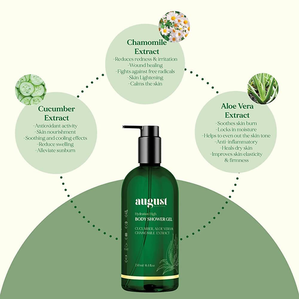 An exceptionally moisturizing and hydrating shower gel enriched with the powerful hydration of cucumber, chamomile, and aloe vera extracts for comprehensive skin nourishment and moisture retention. The advantages include minimizing swelling, reducing redness, and calming irritation. It supports maintaining an even skin tone, enhances skin elasticity and firmness, and relieves sunburn with its anti-inflammatory properties.