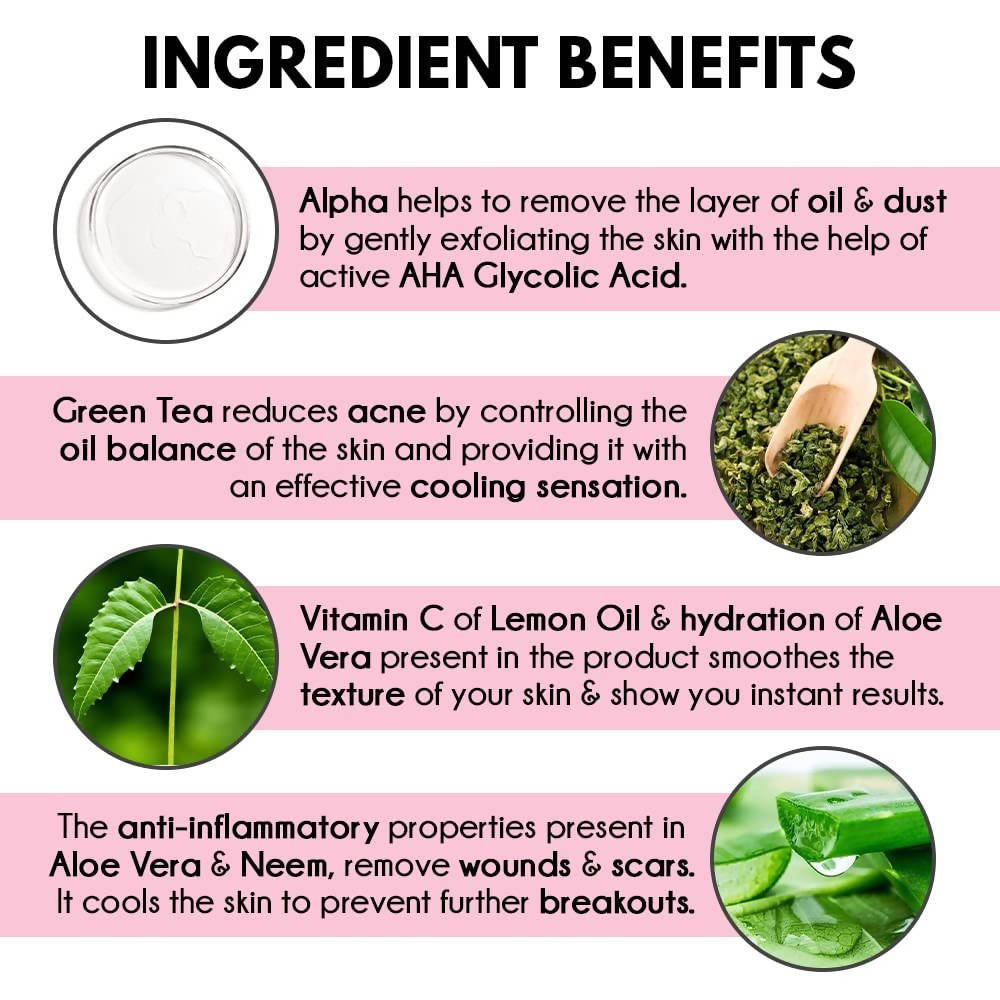 - AHA + Green Tea Extracts, Tea Tree Oil, Aloe Vera, Neem Extracts, Eucalyptus Oil, Lemon Oil, and Mint.