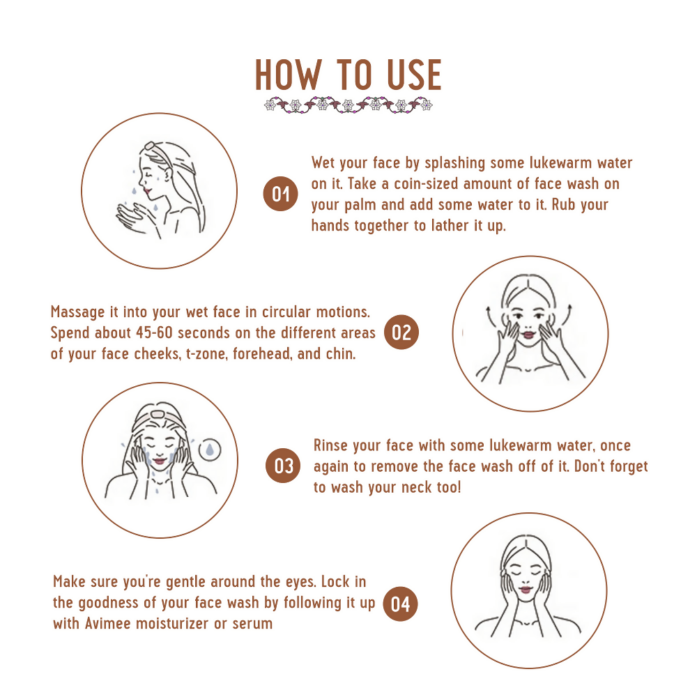 - Moisten your face by splashing some lukewarm water on it. Dispense a coin-sized amount of face wash onto your palm and add a bit of water. Rub your hands together to create a lather. Gently massage it into your damp face using circular motions. Spend around 45-60 seconds on various areas of your face—cheeks, t-zone, forehead, and chin. Remember to cleanse your neck too! Rinse your face with lukewarm water again to remove any residue. Be gentle around the eyes. Seal in the benefits of your face wash by following with Avimee moisturizer or serum.