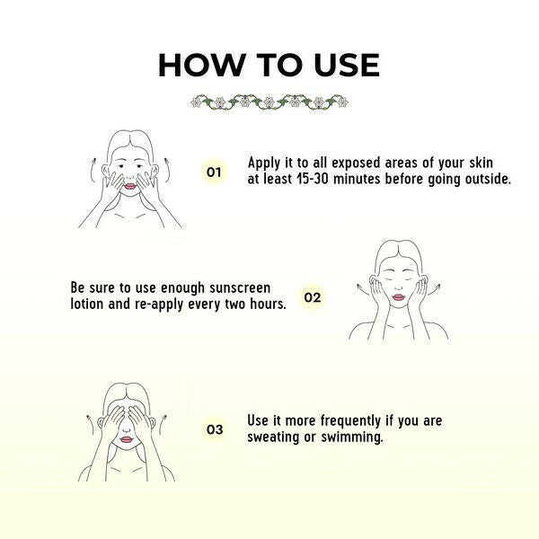 - Generously apply to all exposed skin areas 15-30 minutes prior to sun exposure. Reapply every two hours, or more often if perspiring or swimming.