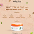 About the Product:- Mukti Gold Aloevera Cream, an opulent fusion of nature's finest essences for your face and body. Enriched with the benefits of Aloevera, Wheatgerm, Turmeric, and Honey, this cream rejuvenates your skin, leaving it velvety, supple, and thoroughly hydrated. Its antioxidant and antibacterial attributes assist in diminishing hyperpigmentation while shielding against UV harm. Ashwagandha tackles aging signs, providing a youthful, luminous glow while reducing wrinkles and dark circles. This cream excels in fading blemishes and delivering a smoother, softer texture. Discover the secret to Nourished, Moisturized & radiant skin!