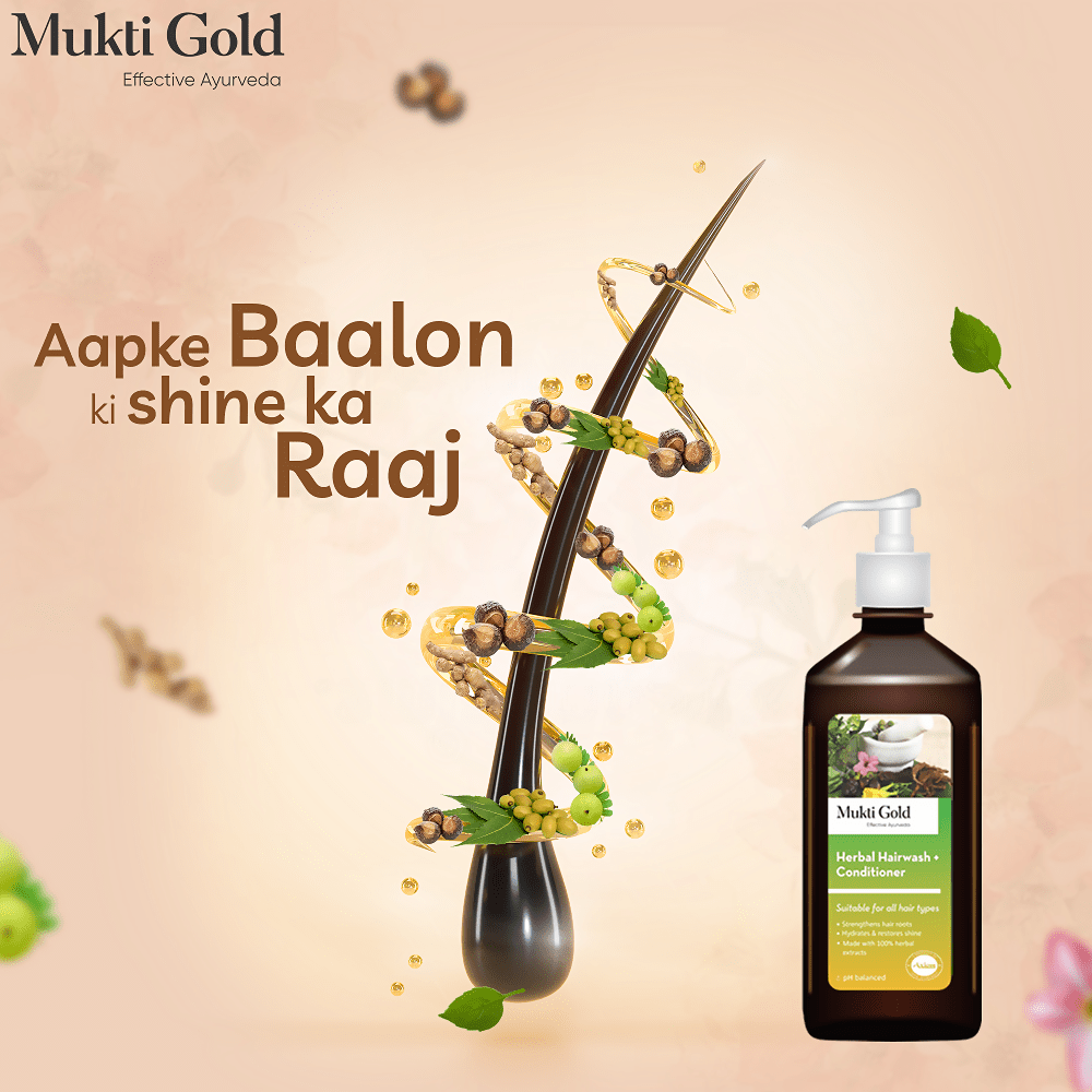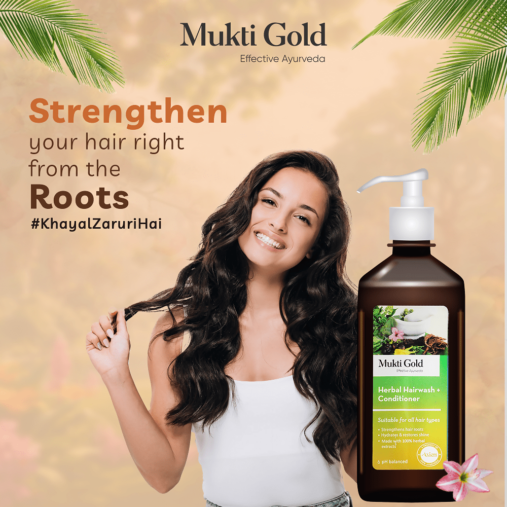 About the Product:- Mukti Gold Herbal Hairwash + Conditioner is a dual-action shampoo and conditioner formulated for dry and unruly hair. Infused with the benefits of aloe vera, bhringraj, amla, and other plant-based extracts, this blend revitalizes your hair from root to tip, leaving it resilient, smooth, and lustrous. Herbal Hairwash + Conditioner mends and fortifies your hair while minimizing frizz for a polished and voluminous finish. Harness the power of nature for more resilient, stunning hair every day.