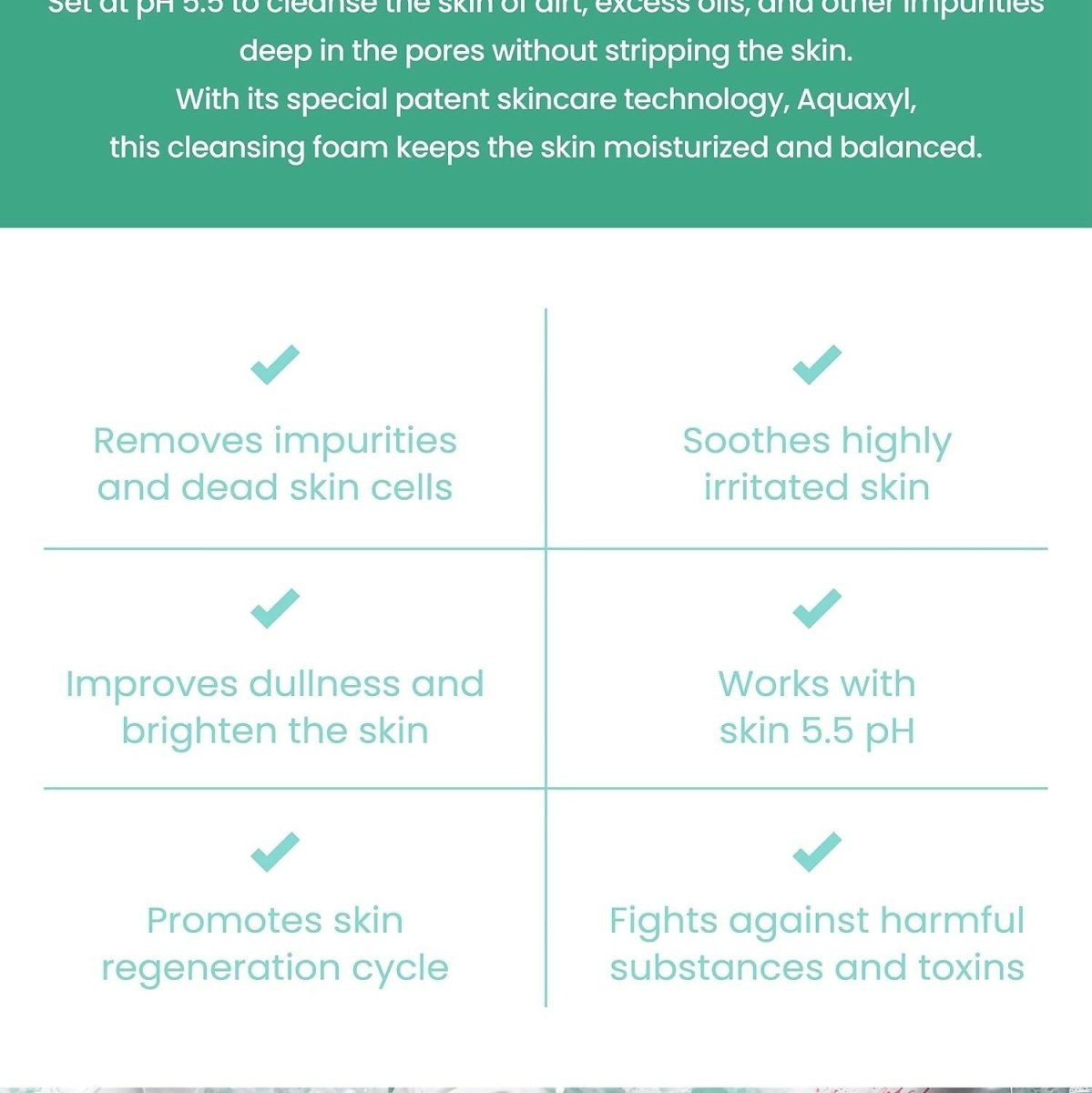 - Our cleansing foam is formulated with a pH of 5.5 to effectively purify the skin of grime, excess oils, and impurities lodged deep within the pores, without disrupting the skin's natural moisture. Featuring the innovative skincare technology, Aquaxyl, this cleanser ensures the skin remains hydrated and balanced. The improved formula incorporates additional moisturizing agents to ensure cleanliness while retaining full moisture. We have doubled the presence of birch sap, along with perilla leaf extract, rice bran, and heartleaf, to leave your skin soft and radiant.