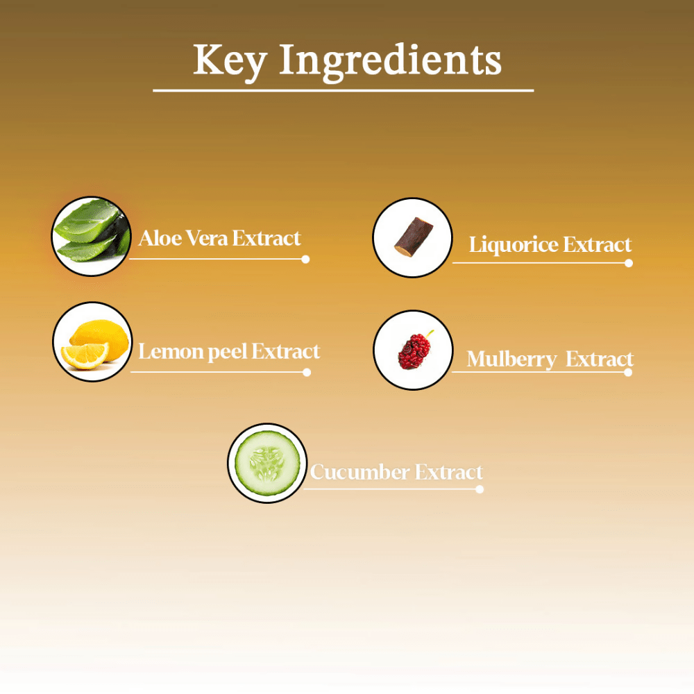 - Coconut Oil, Hyaluronic Acid, Aloe Vera Extract, Lemon Peel Extract, Liquorice Extract, Mulberry Extract, Kojic Acid