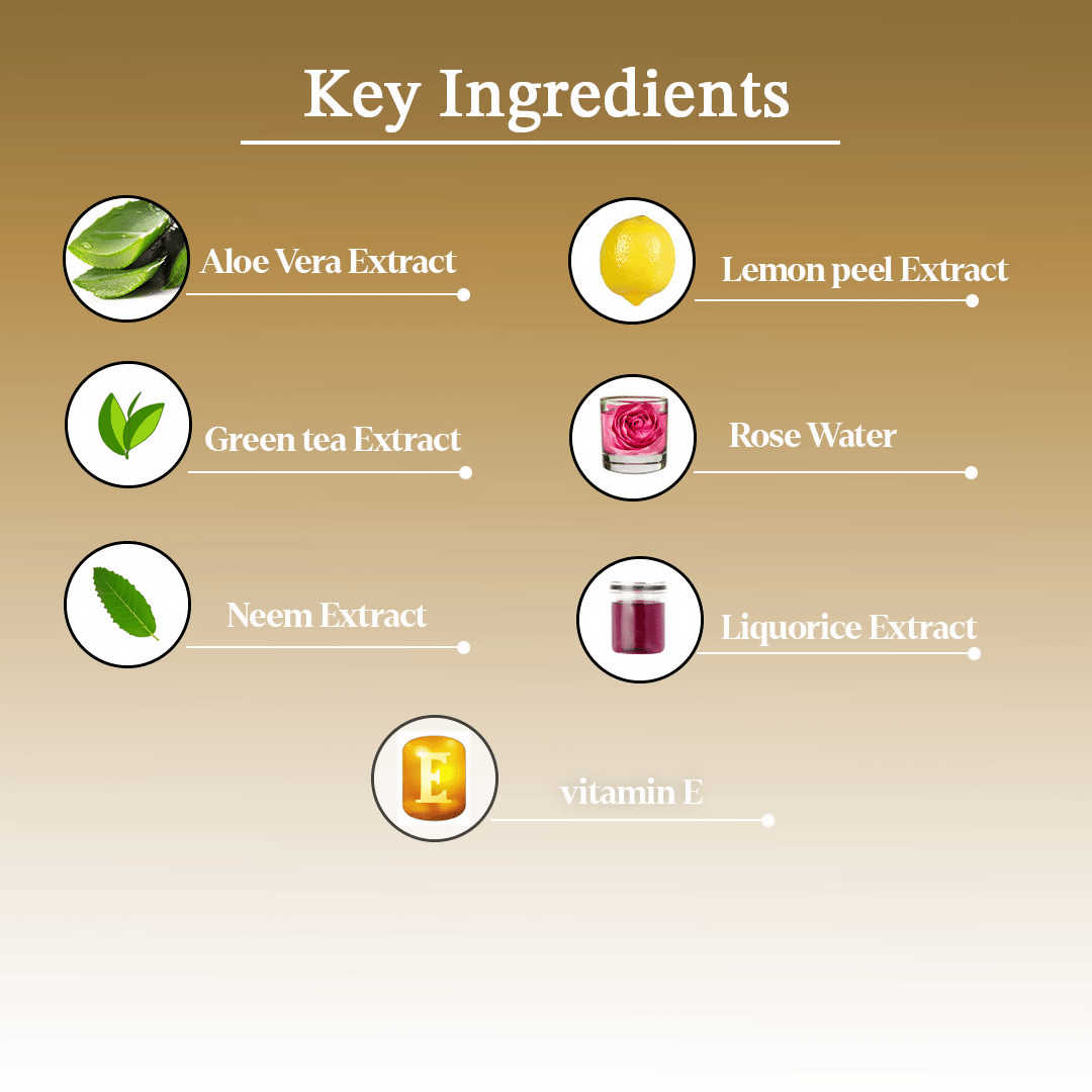 - Aloevera Extract, neem Extract, Rose Water, lemon peel Extract, Green tea Extract, Liquorice Extract, Triethanolamine, vitamin E