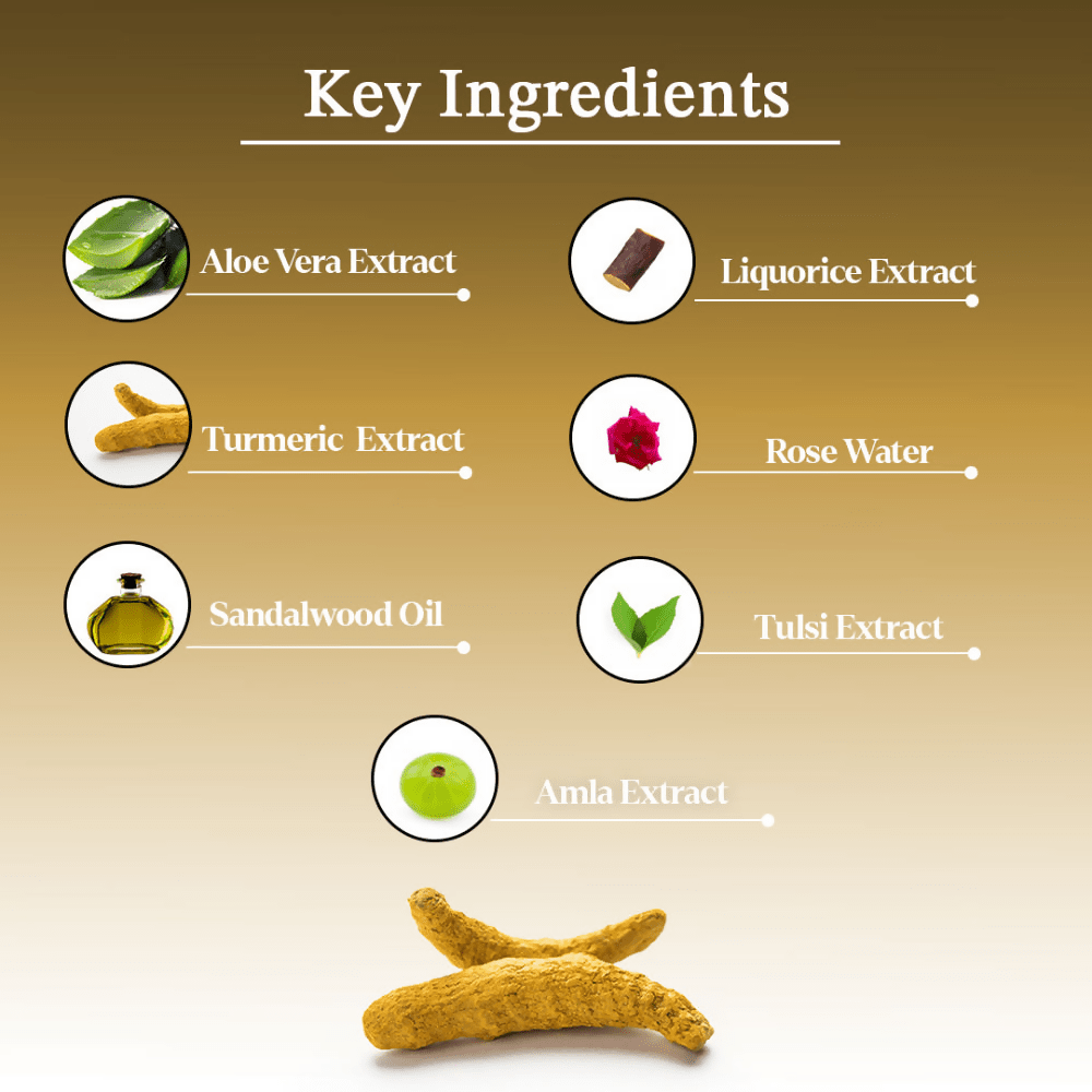 - Aloe Vera Extract, Turmeric Extract, Sandalwood Oil, Rose Water, Tulsi Extract, Amla Extract, Liquorice Extract.