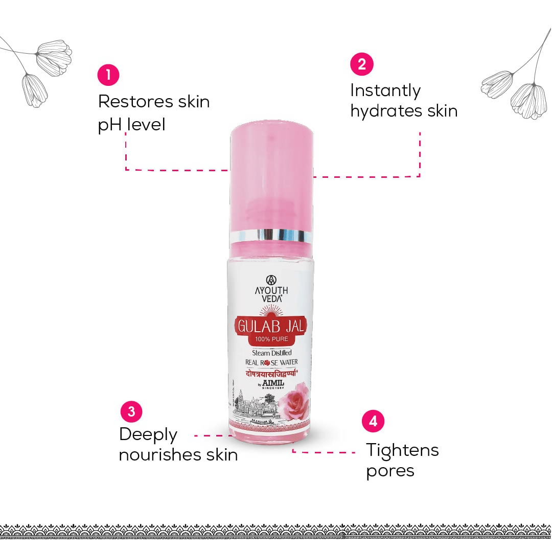 Ayouthveda's Natural Rose Water is exceptional and can be employed for numerous applications. This pure Rose water is ideal for enhancing natural skincare routines. It serves as a delicate cleanser and toner suitable for all skin types, helping to maintain pH balance, encourage skin renewal, and alleviate acne and sunburn.