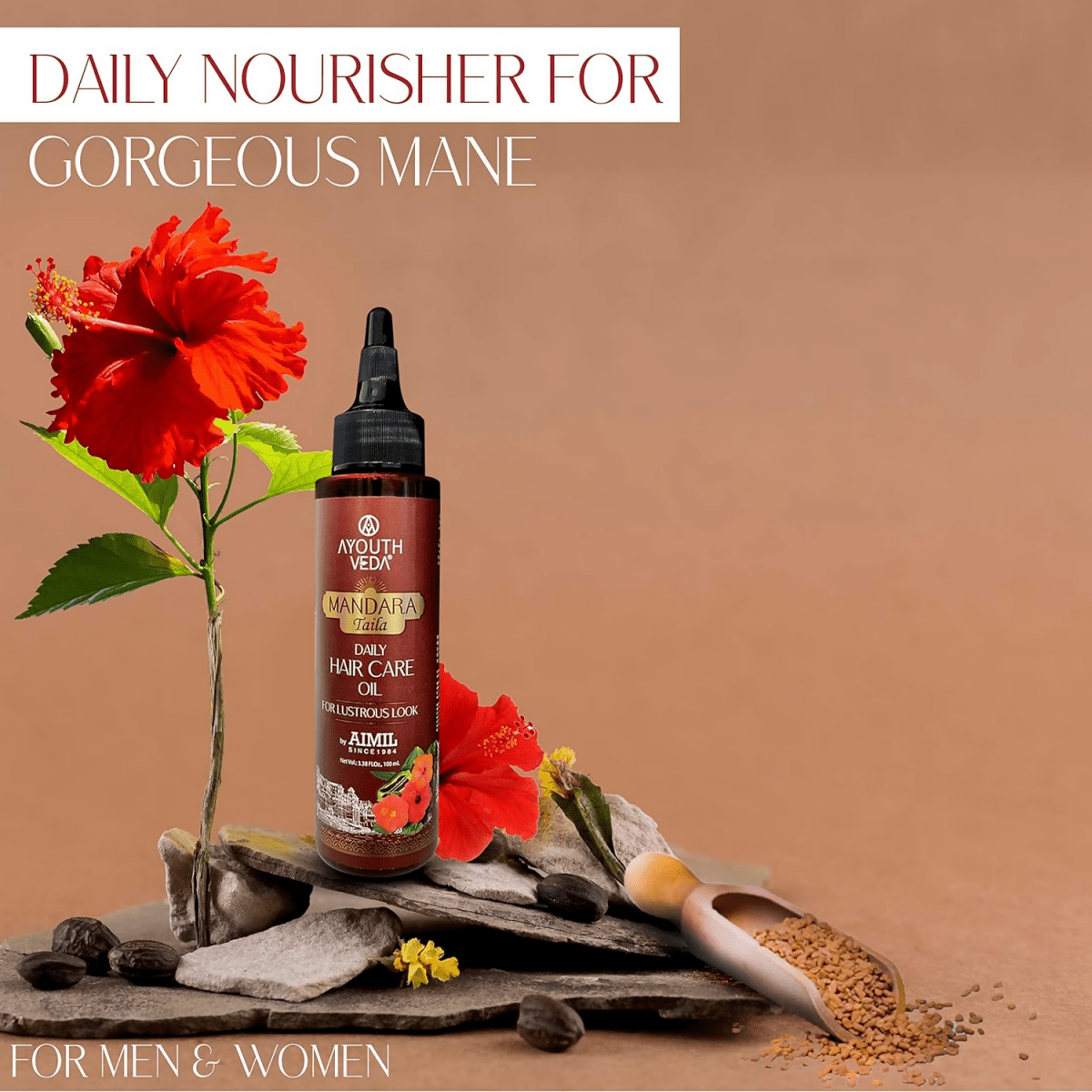 Mandara taila is a nutrient-dense oil enriched with the benefits of ancient knowledge, effectively addressing common hair issues. This formulation is infused with exotic hibiscus blossoms, hair-fortifying fenugreek seeds, and nourishing sesame oil, promoting hair growth, minimizing dandruff, revitalizing the scalp, and imparting exceptional shine and strength to the hair.