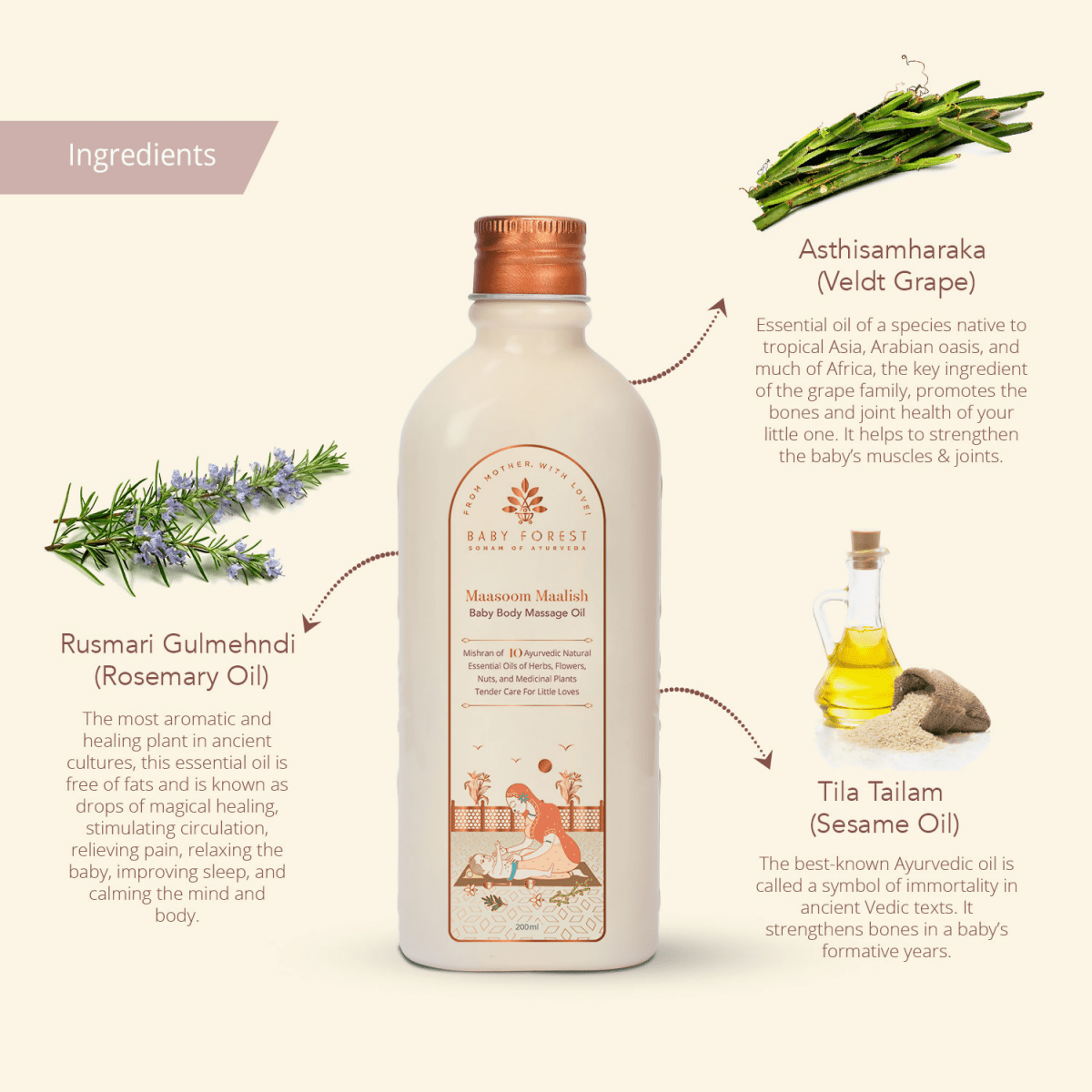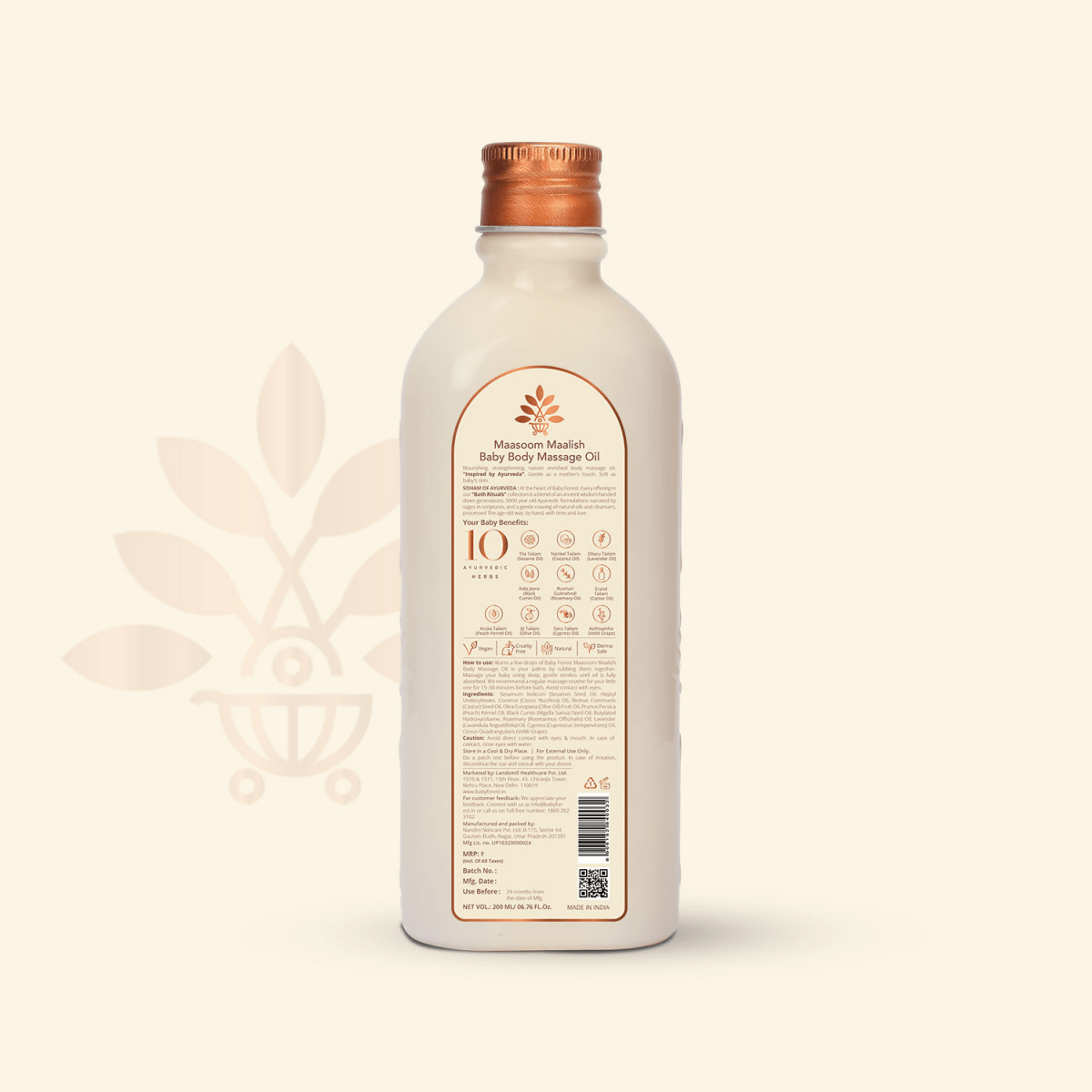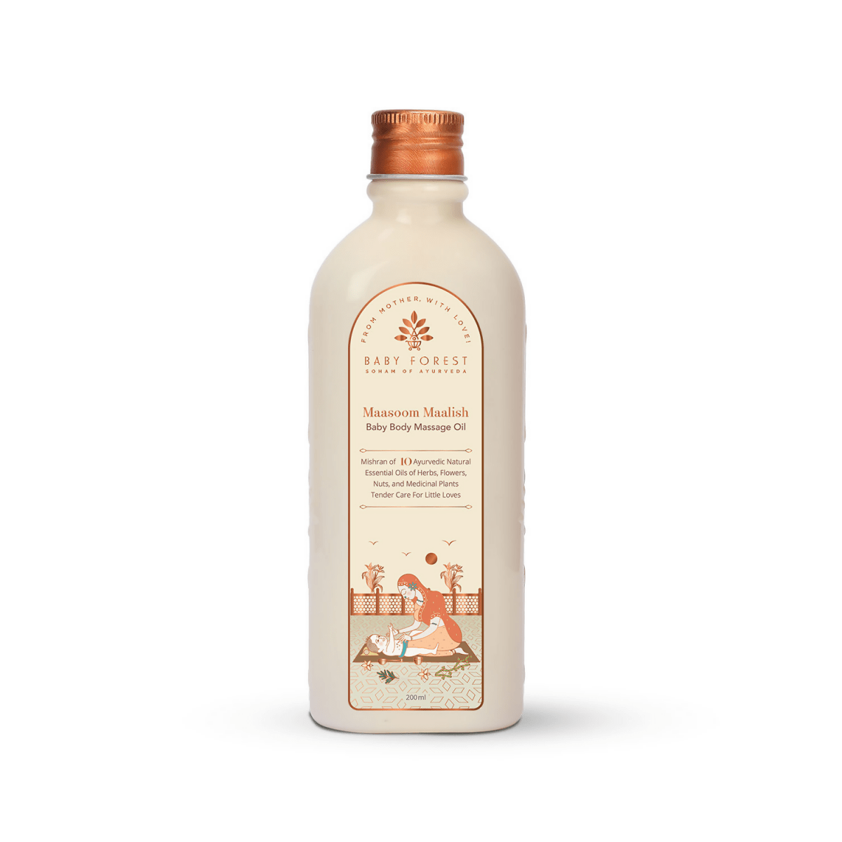 - Warm a few drops of Baby Forest Maasoom Maalish Body Massage Oil in your palms by rubbing them together. Massage your baby using deep, gentle strokes until oil is fully absorbed. We recommend a regular massage routine for your little one for 15-30 minutes before the bath.
