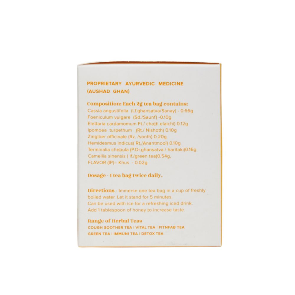 - This invigorating fusion of Green Tea, Senna, Ginger, Fennel, and Elaichi is designed to alleviate persistent constipation, abdominal unease, cramping, and difficulty with bowel movements.