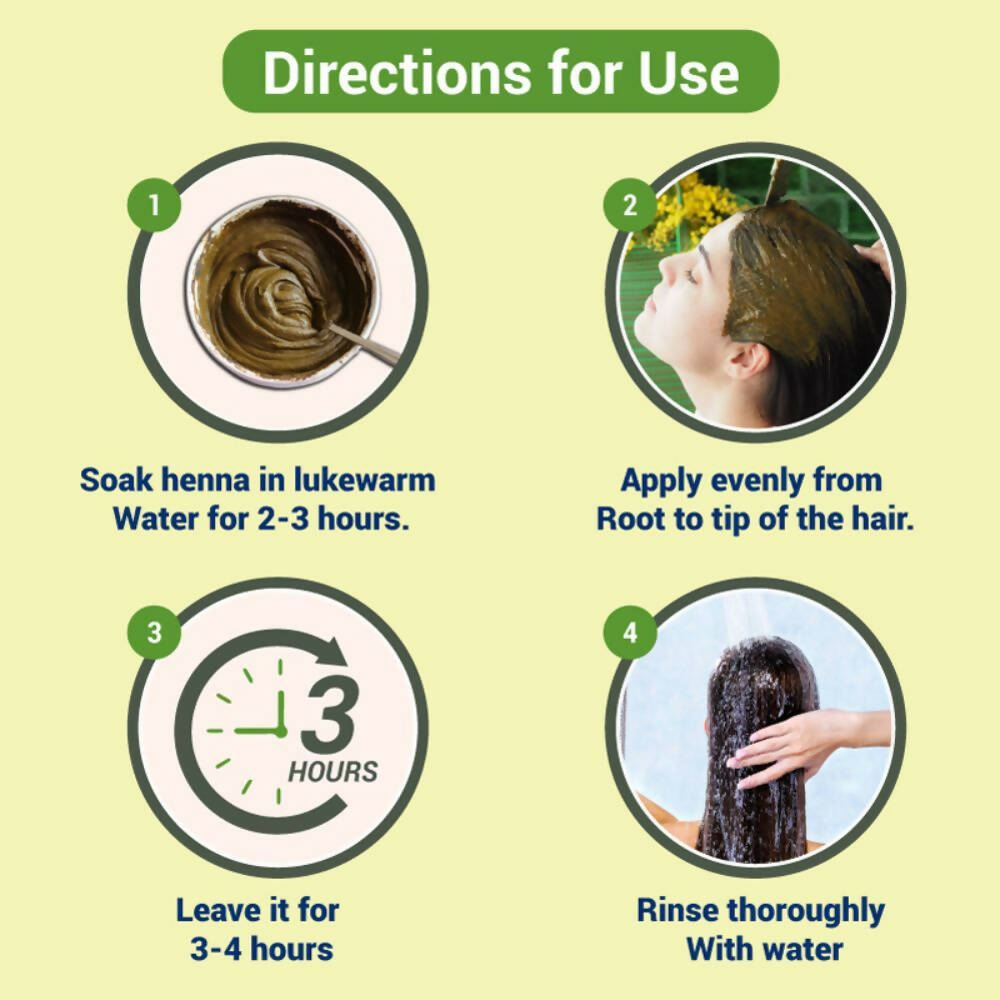 - For Hair: Immerse Henna in warm water for 2-3 hours. Apply uniformly from the roots to the ends of the hair. Leave it on for 3-4 hours and then wash thoroughly with water.