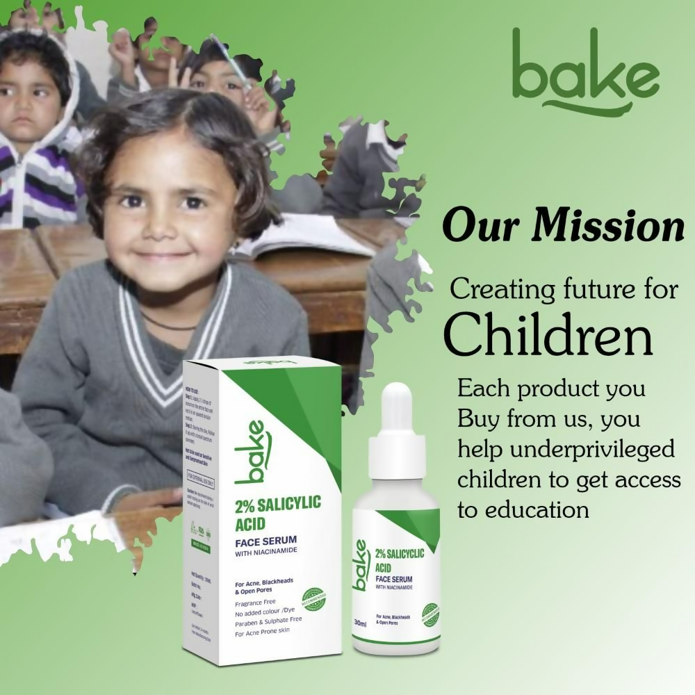 About the Product:- BAKE 2% Salicylic Acid Face Serum is an effective exfoliating formula crafted to tackle acne, blackheads, whiteheads, and congested pores. Its powerful components delve deeply into the skin, preventing future breakouts and fostering a more radiant complexion. Niacinamide helps lessen inflammation and enhances the skin's barrier function.