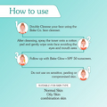 - Post-cleansing, spray the toner onto a cotton pad and gently apply to your face, steering clear of the eyes and mouth area