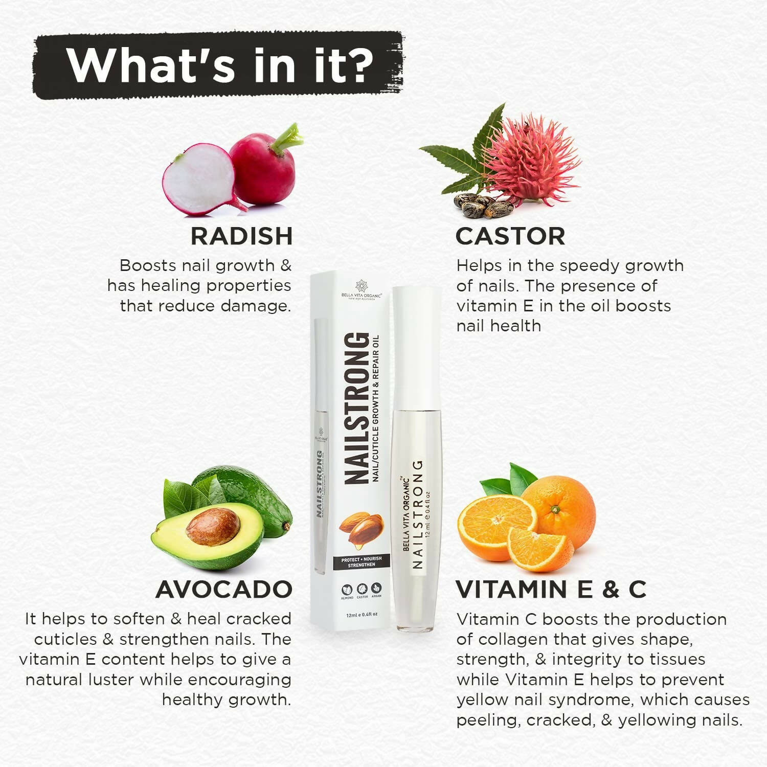 - Nailstrong is a remarkable solution for enhancing your nails' overall health. It mends damage caused by sunlight or harmful chemicals from nail polishes, diminishes nail yellowing, and provides nourishment and fortitude to your nails, preventing them from breaking. The serum also hydrates the cuticles and the surrounding skin, preventing peeling. Castor oil serves as a rich, thick source of Vitamin E and possesses significant moisturizing properties for the cuticle and nail beds, potentially improving nail robustness.