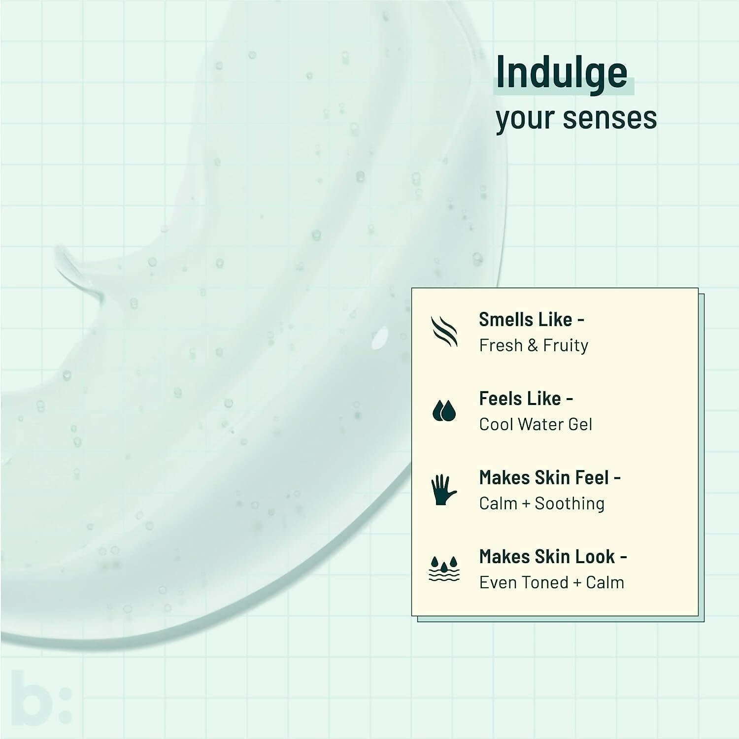 - Cica from Centella Asiatica, Bisabolol from Chamomile, ECGC from Green Tea, Aloe Vera Juice, Natural Betaine