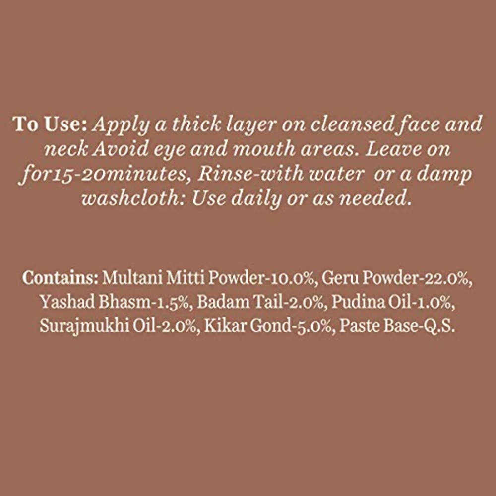 Multani mitti (fuller's earth), gem (red ochre), yasad bhasm (yasad bhasm), badam (prunus amygdalus), pudina (mentha arvensis), kikar gaund (acacia arabica), surajmukhi (helianthus annus), paste base Q.S.