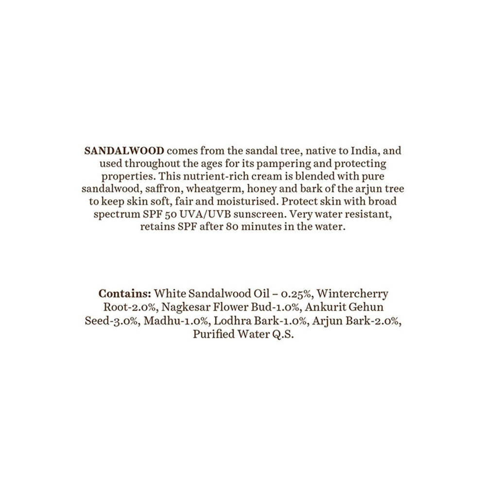 This nutrient-dense cream is infused with pure sandalwood, saffron, wheat germ, honey, and arjun bark to maintain skin's softness, fairness, and hydration. Shields skin with a broad-spectrum SPF 50 UVA/UVB sunscreen. Exceptionally water-resistant, it maintains SPF protection for up to 80 minutes in water.