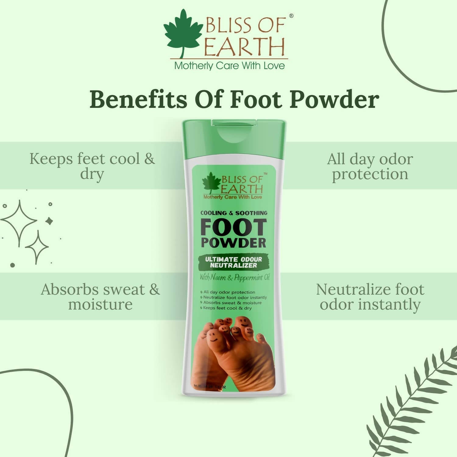 - Bliss of Earth foot powder effectively absorbs moisture and manages wetness to counteract the odor resulting from the damp environment in your footwear