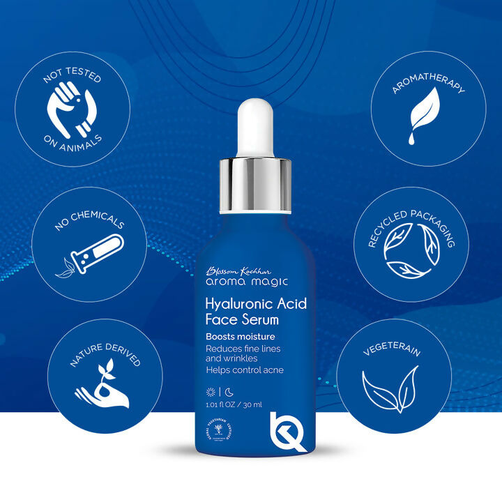 - Blossom Kochhar Aroma Magic Hyaluronic Serum represents a groundbreaking skincare innovation, infused with the potent element, hyaluronic acid. This serum is crafted to deliver outstanding results, beginning with its capacity to enhance moisture levels, offering profound hydration to the skin. Consequently, fine lines and wrinkles are noticeably diminished, unveiling a smoother and more youthful complexion. Moreover, the formulation of this serum aids in controlling acne, fostering a clearer and healthier skin appearance. Discover the transformative advantages of the Blossom Kochhar Aroma Magic Hyaluronic Serum and attain glowing, hydrated, and blemish-free skin that will boost your confidence and beauty.