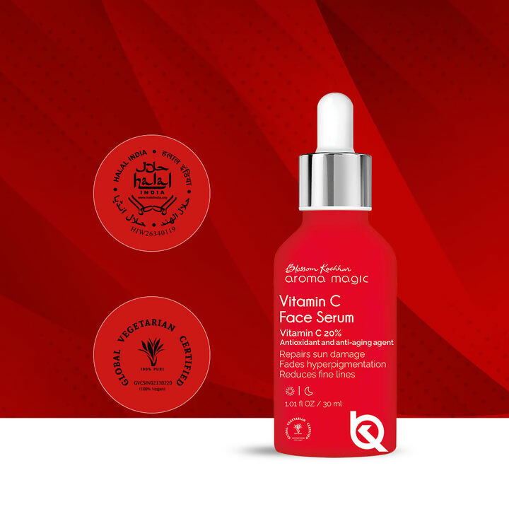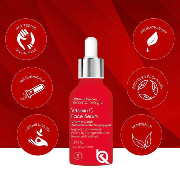 - The Blossom Kochhar Aroma Magic Vitamin C Face Serum is a remarkable skincare solution that fuses the advantages of botanical extracts, essential oils, and vitamin C. This serum functions as a potent antioxidant and anti-aging agent, mending sun damage, addressing hyperpigmentation, and diminishing fine lines. The vitamin C within this serum is derived from natural sources, ensuring high efficacy in boosting collagen synthesis, combating free radicals, and illuminating the complexion. The essential oils and natural extracts in this serum invigorate and refresh the skin, imparting a healthy and luminous appearance. Integrate this Vitamin C Face Serum by Blossom Kochhar Aroma Magic into your daily skincare regimen for youthful, radiant skin.