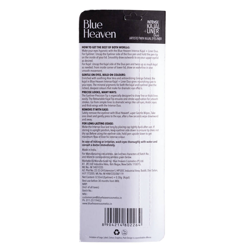 Blue Heaven Intense Kajal + Liner Duo Jet Black: (Eyeliner 0.55 ml + Kajal 0.30 gm)